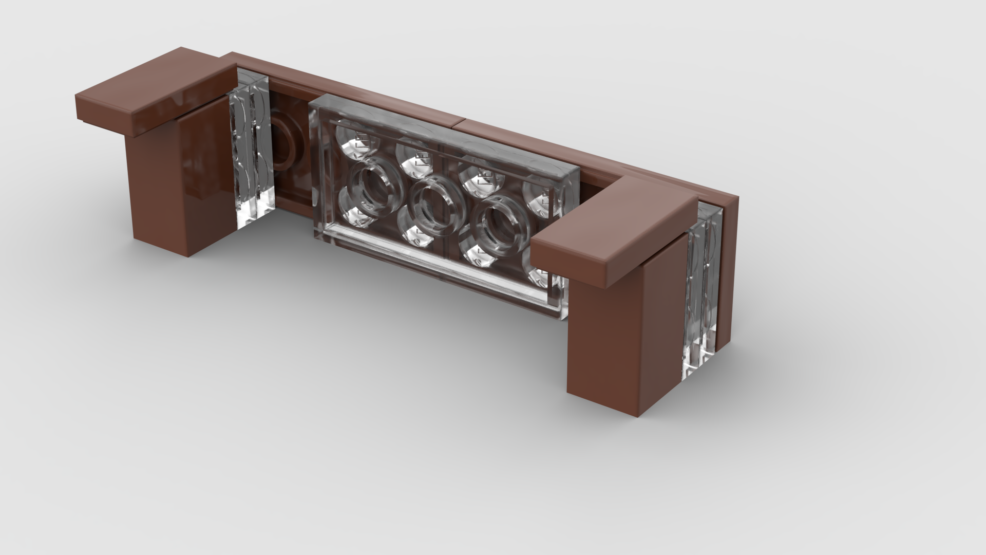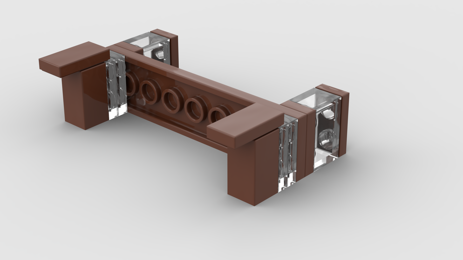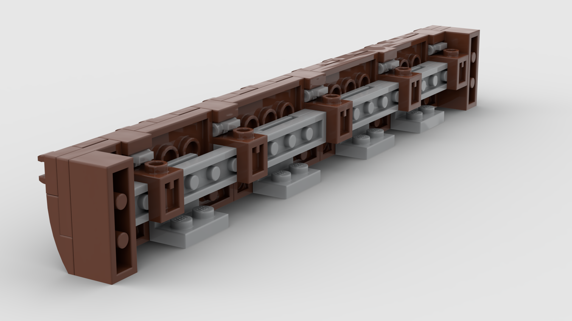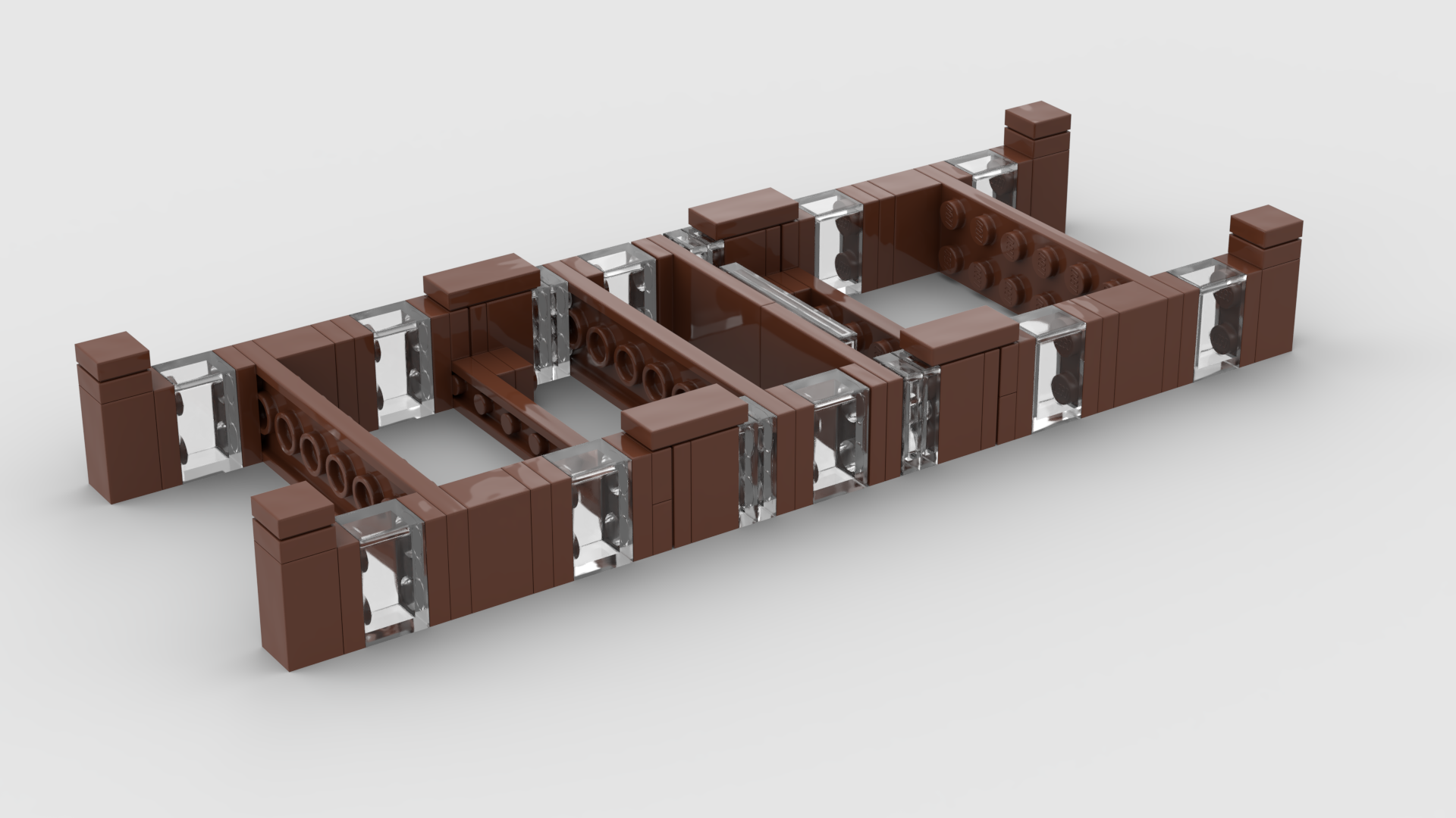 For at opnå stabilitet er de to sider forbundet af tværgående plader. Den viste enhed består af fire dele, hvoraf de to "endestykker" er identiske og bygges ud fra hjørnestolperne fra hver sin side. Hjørnestolpen er en 1x1x1 2/3 klods med knopper på den ene side. Det er vist ret oplagt, hvordan endestykkerne er lavet, men de to mellem-moduler følger her: