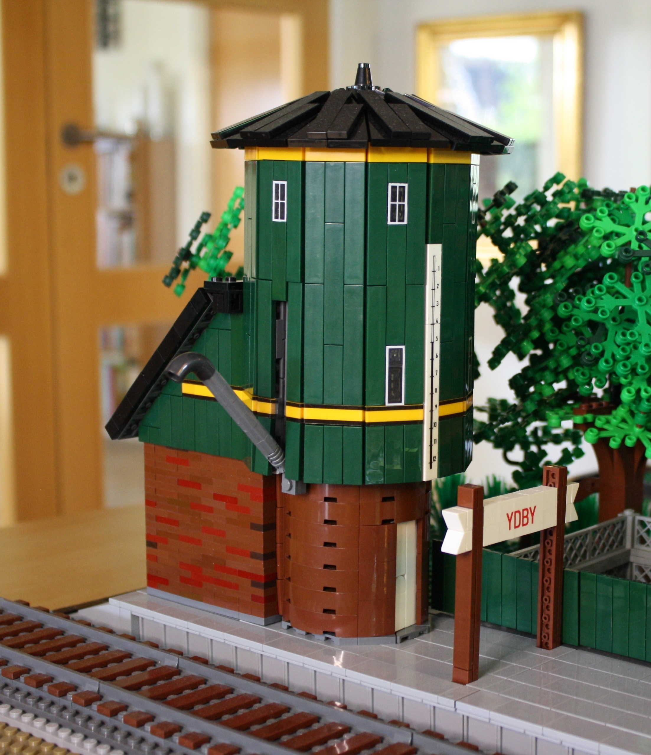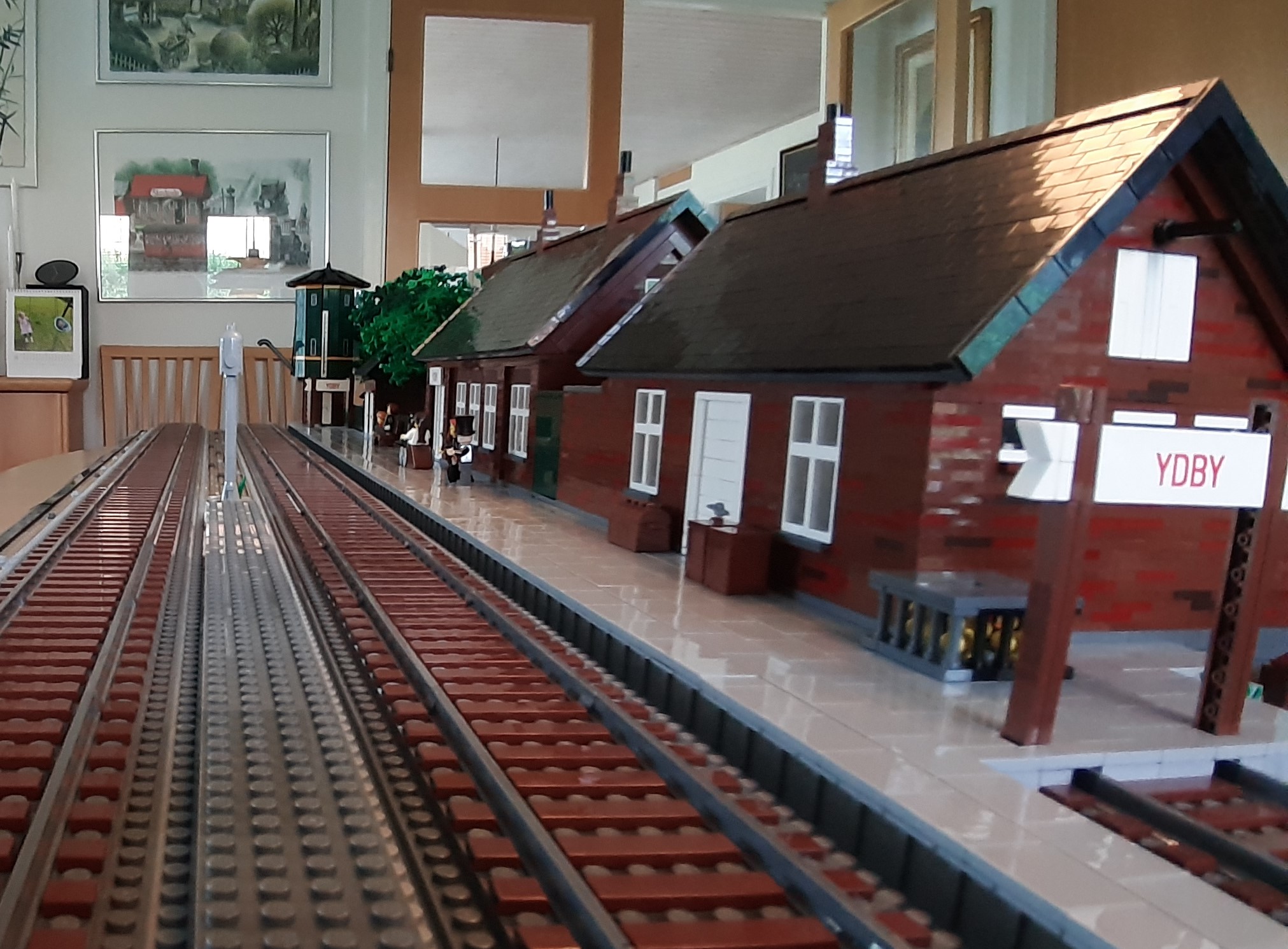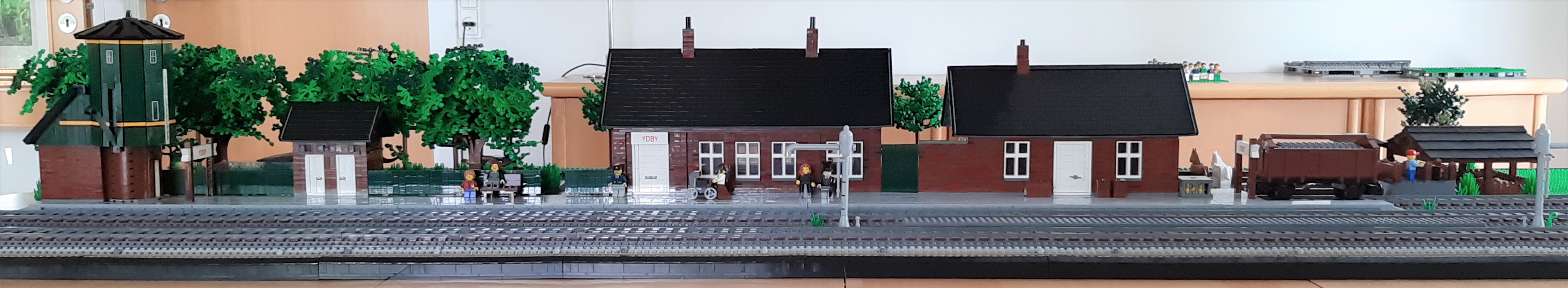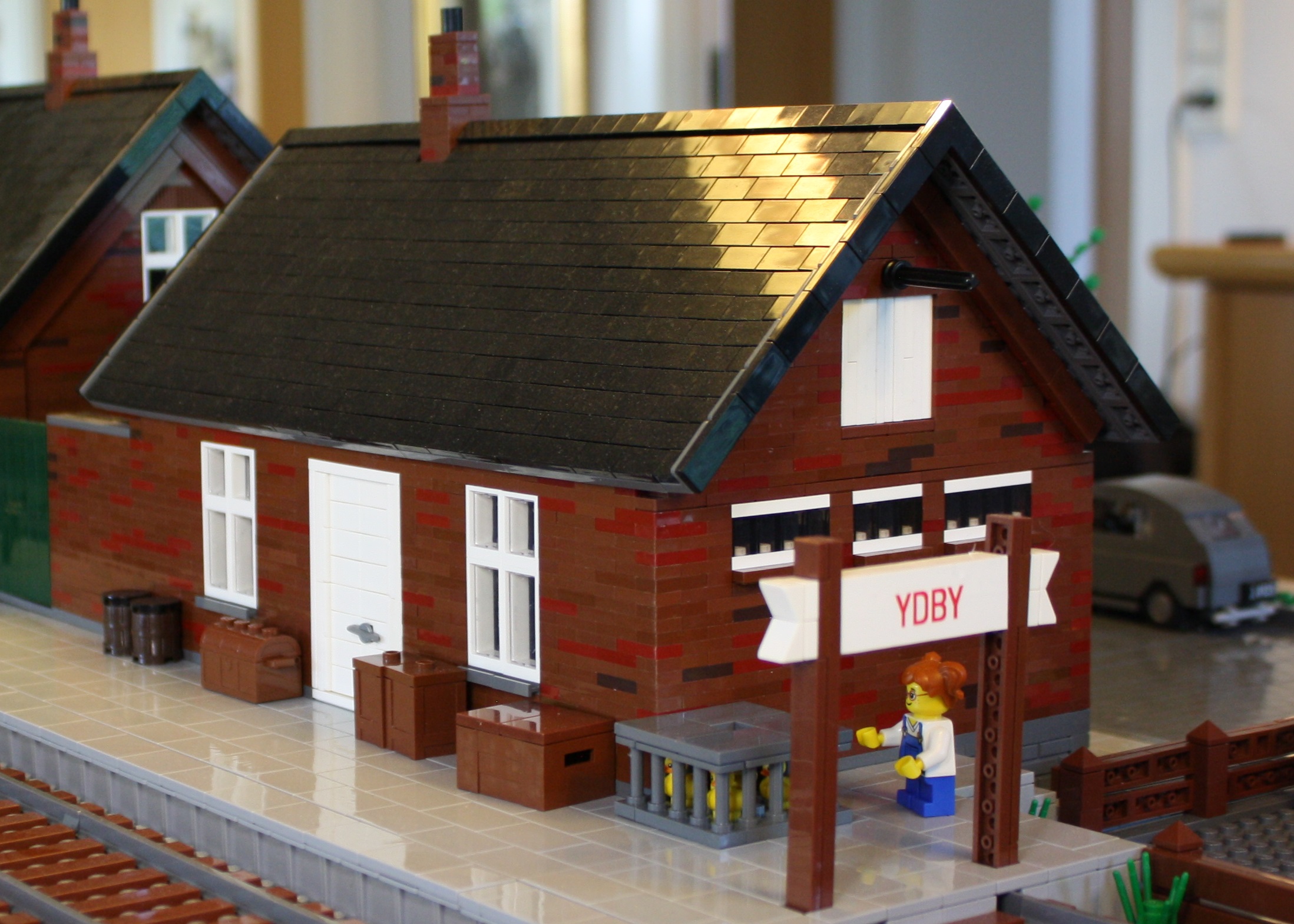 stationsanlægget består af set fra banesiden: ![]() Fra venstre mod højre ses vandtårnet. Dernæst følger toiletbygningen. Begge disse bygninger er på bagsiden omkranset af store træer. I midten af billedet ligger hovedbygningen, og til højre for den ses pakhuset. På læssesporet holder en gammeldags spidsgavlet godsvogn og yderst til højre ses nogle overdækkede svinestier med rampe til toget. Vi skal også lige se det hele fra nogle skrå vinkler. Først kigger vi i retning mod Thisted: ![]() Dernæst i retning mod Struer, hvor man gerne må sammenligne med med dette billede fra Jernbanekilder, der dog er ældre end 1950, som jeg tilstræber at ramme. Derfor slutter perronen lidt før, og vinduerne er stadig mørkegrønne: ![]() De enkele bygninger og anlæg Vandtårnet Ydby ligger præcist midt mellem endestationerne Struer og Thisted. I damptiden var den derfor vandstation, hvilket betyder, at lokomotiverne kunne få påfyldt vand. Af samme grund var der et vandtårn (der i dag er nedrevet) samt to vandkraner (kan ses på det første billede foran hovedbygningen og yderst til højre). På siden af tårnet var der en lille bygning, der rummede et vandrensningsanlæg. Dette kompleks har virkeligt givet udfordringer i LEGO, fordi selve tårnet nederst er rundt. De øverste to-tredjedele består af en 12-kantet trækonstruktion, der ender i et tag formet som en 12-kantet, lav pyramide. Når så også sidebygningens tag skulle indpasses i tårnets trækonstruktion, kom de grå LEGO-hjerneceller på overarbejde. Hertil kommer, at der skulle være en dør i den murede, nederste del af tårnet, og at der i træoverbygningen skulle være to slags vinduer og en udvendig vandmåler. Jeg er dog rimelig tilfreds med resultatet, der ses her: ![]() Som det ses, kunne lokomotiverne også få påfyldt vand direkte fra tårnets tud. Vinduessprosserne er lavet med transparente stickers med hvid tryk (lavet på en Brother Label writer) klæbet på trans-brown tiles. Vandmåleren og de sorte kanter på den nederste gule stribe er lavet med transparente stickers med sort tryk klæbet på henholdsvis hvide og gule tiles. Billedet viser også det klassiske danske stationsskilt med de fligede ender. Det er igen min Brother Label Writer, der er ansvarlig for de røde bogstaver på skiltet. Vi skal også lige se et billede af vandtårnet fra den modsatte side, hvor vi også ser træerne bag ved det: ![]() Toiletbygningen Den lille toiletbygning er der ikke så meget at sige om, men her ses den: ![]() Hovedbygningen Vi er så nået til den vigtigste bygning på anlægget, nemlig selve hovedbygningen, der ses her: ![]() Jeg har valgt at bygge alle røde murstensmure af 1x2 plader med reddish brown som hovedfarve, men ca 20% af pladerne i dark red og nogle få procent i dark brown. Formålet er naturligvis at få et mere levende murværk. Taget er lavet af 1x2 tiles for at få det til at ligne skifertag. Hvad angår selve bygningen, ligger ventesalen i venstre ende (de store vinduer i gavlen). Stationens kontor befinder sig bag de to første vinduer mod perronen, og de to sidste vinduer hører til stationsforstanderens lejlighed (han boede jo på stedet). Det lille vindue (2 fag) er til spisestuen og det store vindue (3 fag) er til soveværelset. Det er en sjov tanke, at når folk færdedes på perronen, har de gået lige uden for vinduerne til forstanderens private bolig. På første sal er der (i modsatte gavl) et pigeværelse. For en ordens skyld skal jeg understrege, at bygningen i min model ikke er indrettet. Der er tomt (et stort rum) bag alle vinduer. Pakhuset For en landstation som Ydby er pakhuset uhyre vigtigt. Thybanen blev straks fra starten en kæmpe succes og banen åbnede sognet op for omverdenen. Stykgods til egnens virksomheder og landmænd fyldte meget, og levende dyr blev sendt med toget. Vi ser pakhuset her: ![]() Som det måske kan fornemmes på billedet, er pakhuset opført i en mere ydmyg stil end hovedbygningen. I den ende, der ligger nærmest hovedbygningen var der dels et vaskerum og dels et rum til brændsel. Begge rum havde indgang fra den lille gård, der findes mellem de to bygninger. I gavlen kan man måske fornemme, at der stikker en bjælke ud (over gavllemmen), der blev brugt til at hejse varer op på loftet. I forgrunden ses det andet stationsskilt. Foldanlægget Levende dyr var en vigtig godstype for enhver landstation i ”gamle dage”. Det var også tilfældet i Ydby, hvor der var en grusbelagt kvægfold og overdækkede svinestier med brolægning. Både stier og fold havde rampe til toget. Her ser vi først svinestierne fra banesiden, hvor en QH vogn (endnu ikke helt færdig) er klar til at blive læsset med levende svin: ![]() Hvis vi i stedet bevæger os om på den anden side, ses hele anlægget: ![]() Til højre ses kvægfolden, hvor en ko og et par heste venter på at blive sendt med toget. Til venstre ses først svineanlæggets modtagefold, dernæst den lille vejerbod efterfulgt af de overdækkede svinestier og ramperne. En flok svin er på vej op ad rampen for at blive læsset på QH vognen. Gadesiden ”Gadesiden” skal tages med forbehold. Ydby er en landstation, og der er ikke nogen "gade" på bagsiden. Det er blot en indkørsel til stationen. Jeg antager, at indkørsel og parkeringsplads har været brolagt, hvilket er søgt efterlignet med liggende (let forskudte) 1x1 klodser i DBG. Min oprindelige plan var at blande med gammel dark gray og sand blue (tror jeg nok, det hedder) for at få mere realistisk spil i brolægningen (hvor der er brugt flere tusinde klodser), men prisniveauet på BrickLink overbeviste mig om, at det var godt nok med DBG. Vi ser bygningerne set fra ”gaden” ![]() Især hovedbygningen, synes jeg, tager sig godt ud. Datidens arkitekter i DSB kunne simpelthen noget. Livet på en landstation Passagerer Ydby er et lille sogn med begrænset indbyggertal. Det har derfor aldrig myldret med mennesker på perronerne, men nogle var der nat
