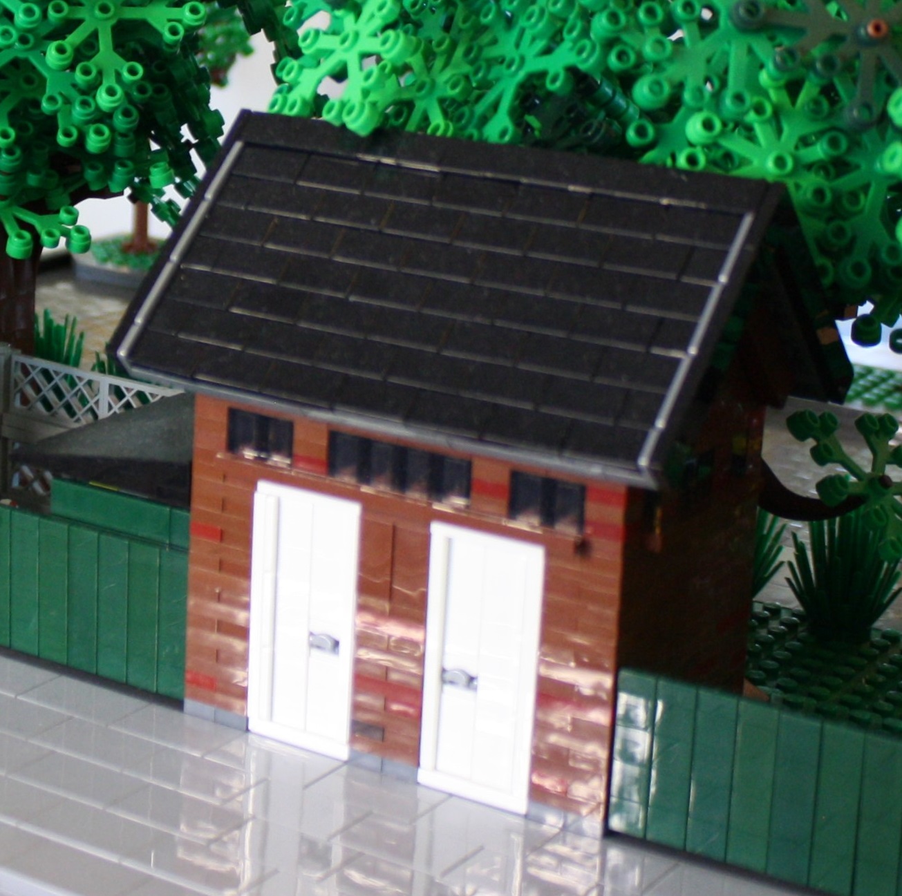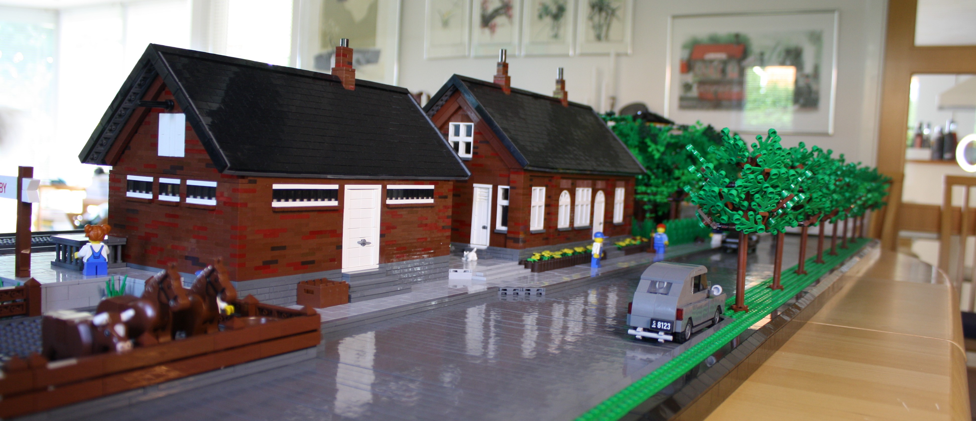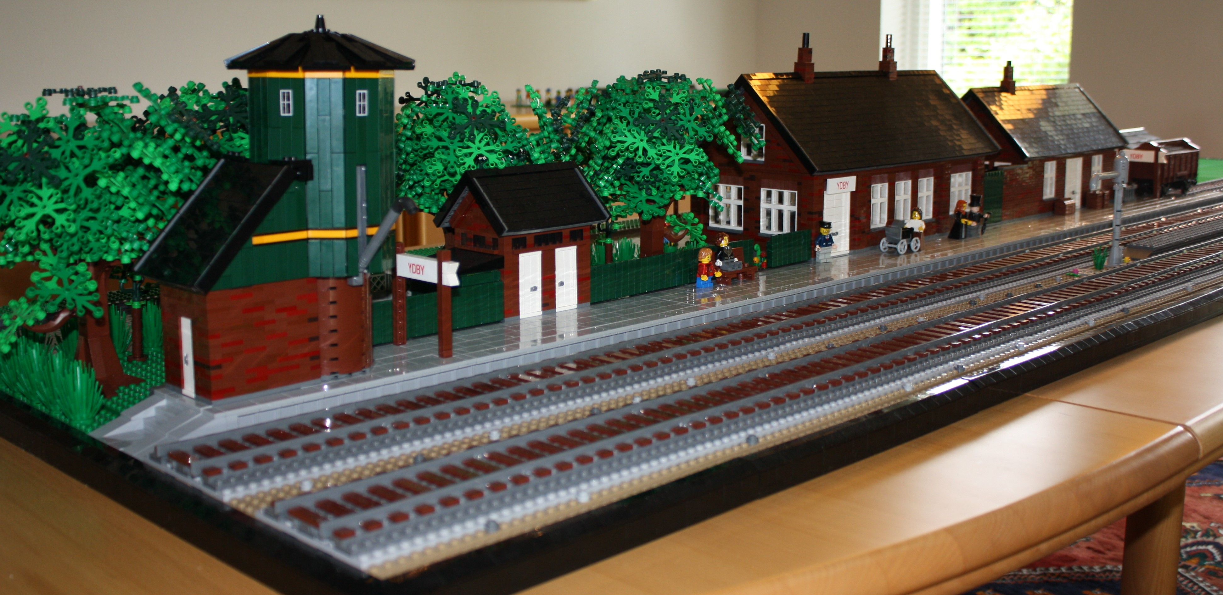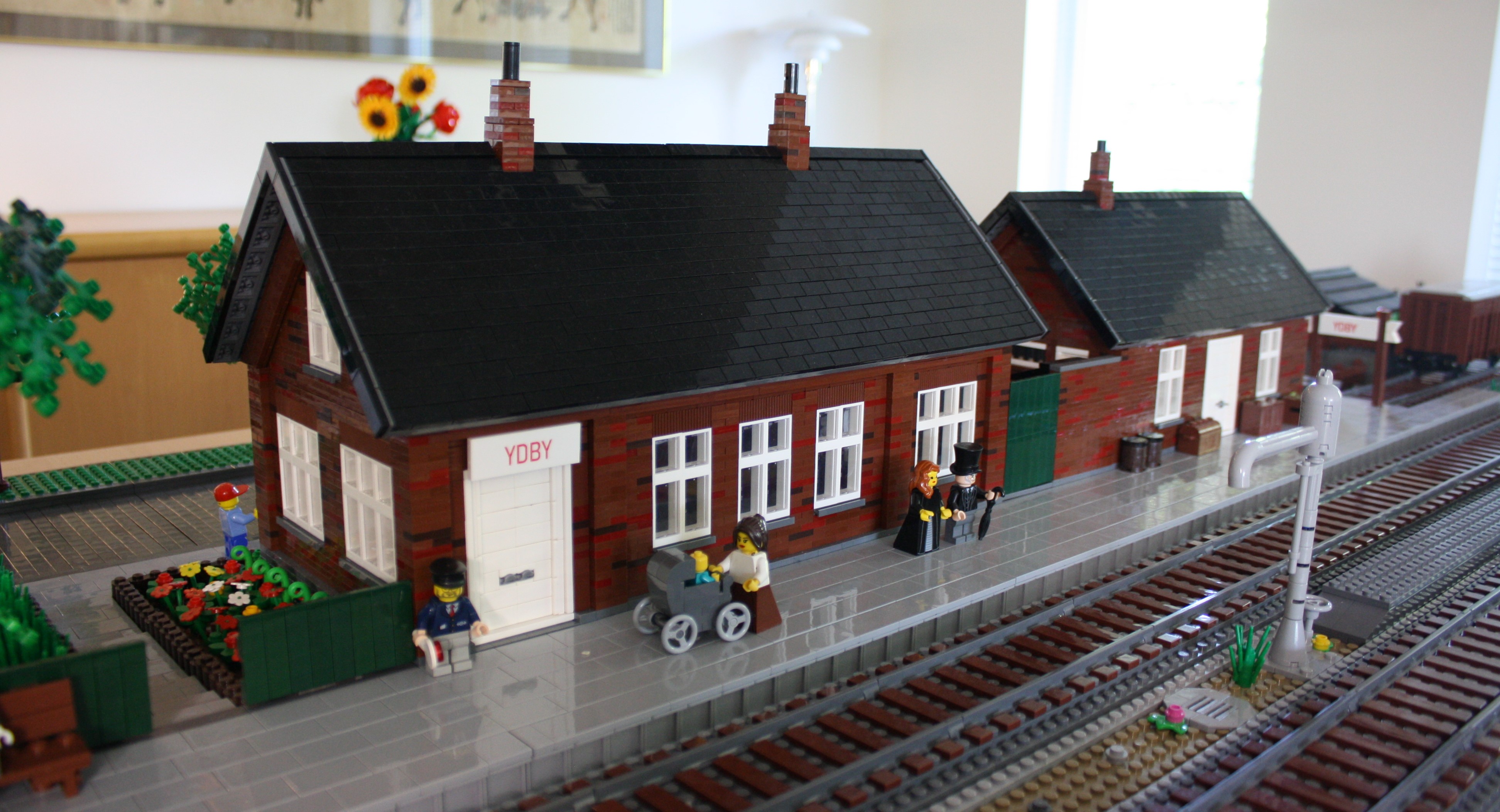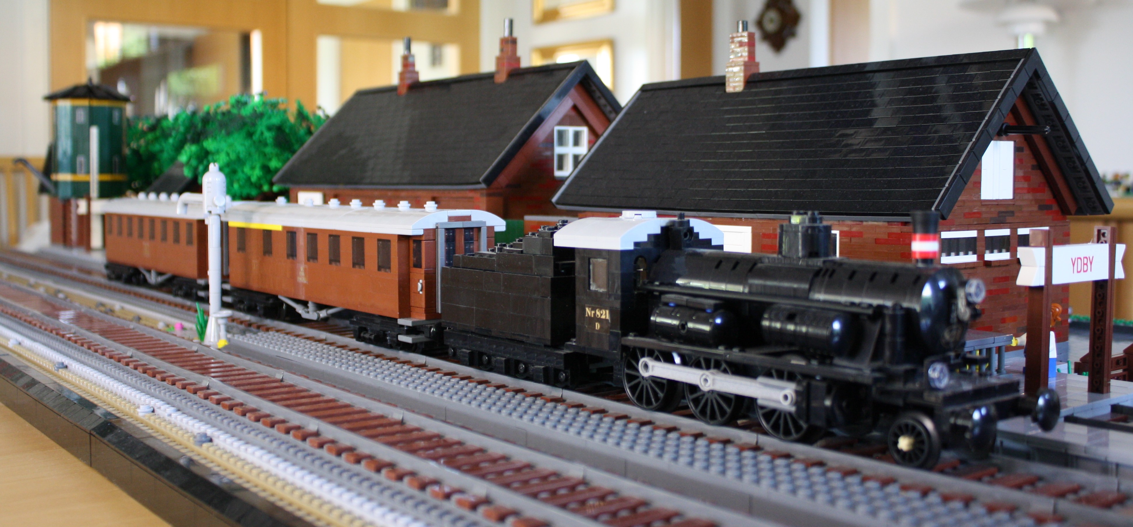 stationsanlægget består af set fra banesiden: ![]() Fra venstre mod højre ses vandtårnet. Dernæst følger toiletbygningen. Begge disse bygninger er på bagsiden omkranset af store træer. I midten af billedet ligger hovedbygningen, og til højre for den ses pakhuset. På læssesporet holder en gammeldags spidsgavlet godsvogn og yderst til højre ses nogle overdækkede svinestier med rampe til toget. Vi skal også lige se det hele fra nogle skrå vinkler. Først kigger vi i retning mod Thisted: ![]() Dernæst i retning mod Struer, hvor man gerne må sammenligne med med dette billede fra Jernbanekilder, der dog er ældre end 1950, som jeg tilstræber at ramme. Derfor slutter perronen lidt før, og vinduerne er stadig mørkegrønne: ![]() De enkele bygninger og anlæg Vandtårnet Ydby ligger præcist midt mellem endestationerne Struer og Thisted. I damptiden var den derfor vandstation, hvilket betyder, at lokomotiverne kunne få påfyldt vand. Af samme grund var der et vandtårn (der i dag er nedrevet) samt to vandkraner (kan ses på det første billede foran hovedbygningen og yderst til højre). På siden af tårnet var der en lille bygning, der rummede et vandrensningsanlæg. Dette kompleks har virkeligt givet udfordringer i LEGO, fordi selve tårnet nederst er rundt. De øverste to-tredjedele består af en 12-kantet trækonstruktion, der ender i et tag formet som en 12-kantet, lav pyramide. Når så også sidebygningens tag skulle indpasses i tårnets trækonstruktion, kom de grå LEGO-hjerneceller på overarbejde. Hertil kommer, at der skulle være en dør i den murede, nederste del af tårnet, og at der i træoverbygningen skulle være to slags vinduer og en udvendig vandmåler. Jeg er dog rimelig tilfreds med resultatet, der ses her: ![]() Som det ses, kunne lokomotiverne også få påfyldt vand direkte fra tårnets tud. Vinduessprosserne er lavet med transparente stickers med hvid tryk (lavet på en Brother Label writer) klæbet på trans-brown tiles. Vandmåleren og de sorte kanter på den nederste gule stribe er lavet med transparente stickers med sort tryk klæbet på henholdsvis hvide og gule tiles. Billedet viser også det klassiske danske stationsskilt med de fligede ender. Det er igen min Brother Label Writer, der er ansvarlig for de røde bogstaver på skiltet. Vi skal også lige se et billede af vandtårnet fra den modsatte side, hvor vi også ser træerne bag ved det: ![]() Toiletbygningen Den lille toiletbygning er der ikke så meget at sige om, men her ses den: ![]() Hovedbygningen Vi er så nået til den vigtigste bygning på anlægget, nemlig selve hovedbygningen, der ses her: ![]() Jeg har valgt at bygge alle røde murstensmure af 1x2 plader med reddish brown som hovedfarve, men ca 20% af pladerne i dark red og nogle få procent i dark brown. Formålet er naturligvis at få et mere levende murværk. Taget er lavet af 1x2 tiles for at få det til at ligne skifertag. Hvad angår selve bygningen, ligger ventesalen i venstre ende (de store vinduer i gavlen). Stationens kontor befinder sig bag de to første vinduer mod perronen, og de to sidste vinduer hører til stationsforstanderens lejlighed (han boede jo på stedet). Det lille vindue (2 fag) er til spisestuen og det store vindue (3 fag) er til soveværelset. Det er en sjov tanke, at når folk færdedes på perronen, har de gået lige uden for vinduerne til forstanderens private bolig. På første sal er der (i modsatte gavl) et pigeværelse. For en ordens skyld skal jeg understrege, at bygningen i min model ikke er indrettet. Der er tomt (et stort rum) bag alle vinduer. Pakhuset For en landstation som Ydby er pakhuset uhyre vigtigt. Thybanen blev straks fra starten en kæmpe succes og banen åbnede sognet op for omverdenen. Stykgods til egnens virksomheder og landmænd fyldte meget, og levende dyr blev sendt med toget. Vi ser pakhuset her: ![]() Som det måske kan fornemmes på billedet, er pakhuset opført i en mere ydmyg stil end hovedbygningen. I den ende, der ligger nærmest hovedbygningen var der dels et vaskerum og dels et rum til brændsel. Begge rum havde indgang fra den lille gård, der findes mellem de to bygninger. I gavlen kan man måske fornemme, at der stikker en bjælke ud (over gavllemmen), der blev brugt til at hejse varer op på loftet. I forgrunden ses det andet stationsskilt. Foldanlægget Levende dyr var en vigtig godstype for enhver landstation i ”gamle dage”. Det var også tilfældet i Ydby, hvor der var en grusbelagt kvægfold og overdækkede svinestier med brolægning. Både stier og fold havde rampe til toget. Her ser vi først svinestierne fra banesiden, hvor en QH vogn (endnu ikke helt færdig) er klar til at blive læsset med levende svin: ![]() Hvis vi i stedet bevæger os om på den anden side, ses hele anlægget: ![]() Til højre ses kvægfolden, hvor en ko og et par heste venter på at blive sendt med toget. Til venstre ses først svineanlæggets modtagefold, dernæst den lille vejerbod efterfulgt af de overdækkede svinestier og ramperne. En flok svin er på vej op ad rampen for at blive læsset på QH vognen. Gadesiden ”Gadesiden” skal tages med forbehold. Ydby er en landstation, og der er ikke nogen "gade" på bagsiden. Det er blot en indkørsel til stationen. Jeg antager, at indkørsel og parkeringsplads har været brolagt, hvilket er søgt efterlignet med liggende (let forskudte) 1x1 klodser i DBG. Min oprindelige plan var at blande med gammel dark gray og sand blue (tror jeg nok, det hedder) for at få mere realistisk spil i brolægningen (hvor der er brugt flere tusinde klodser), men prisniveauet på BrickLink overbeviste mig om, at det var godt nok med DBG. Vi ser bygningerne set fra ”gaden” ![]() Især hovedbygningen, synes jeg, tager sig godt ud. Datidens arkitekter i DSB kunne simpelthen noget. Livet på en landstation Passagerer Ydby er et lille sogn med begrænset indbyggertal. Det har derfor aldrig myldret med mennesker på perronerne, men nogle var der nat