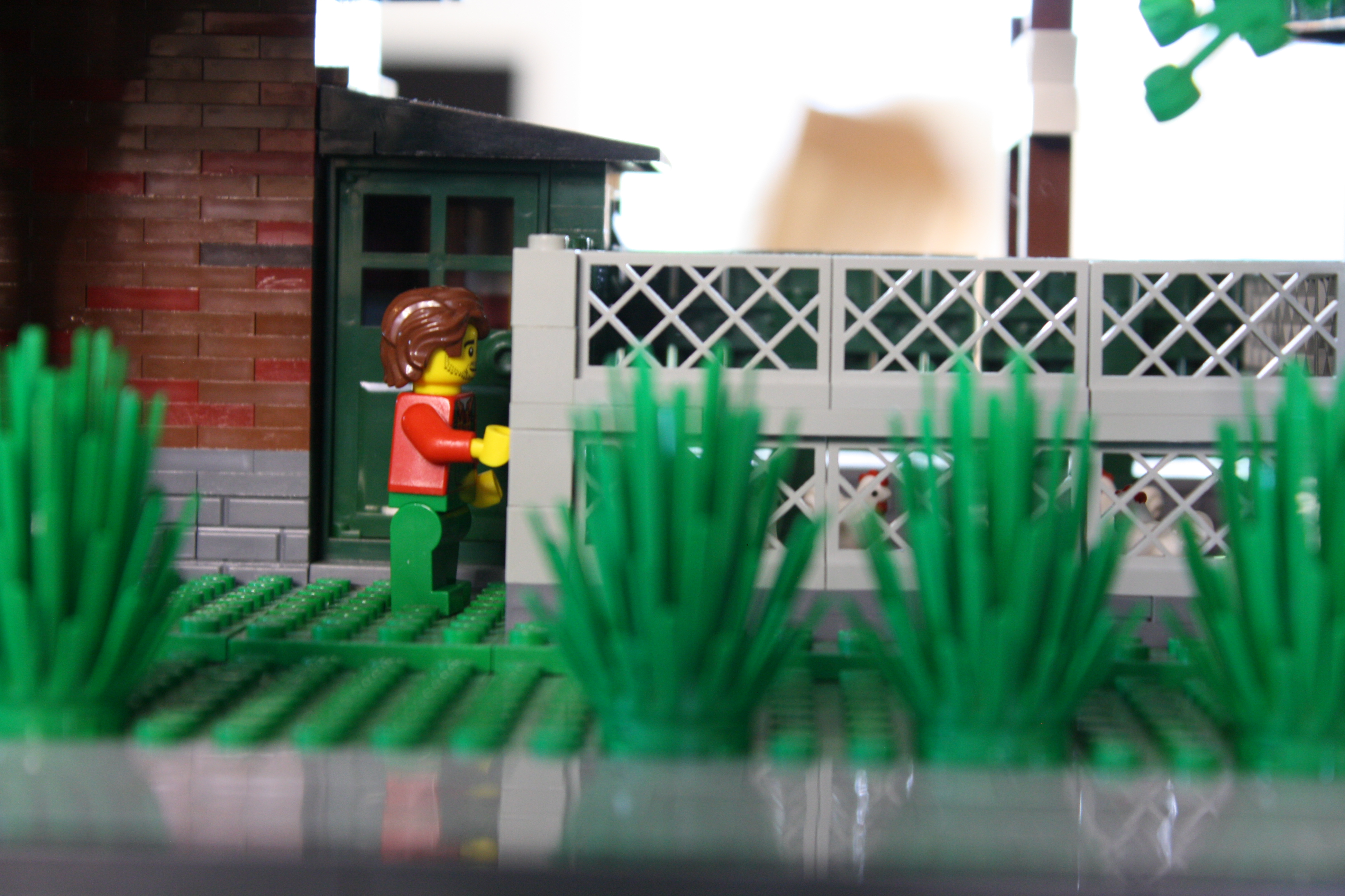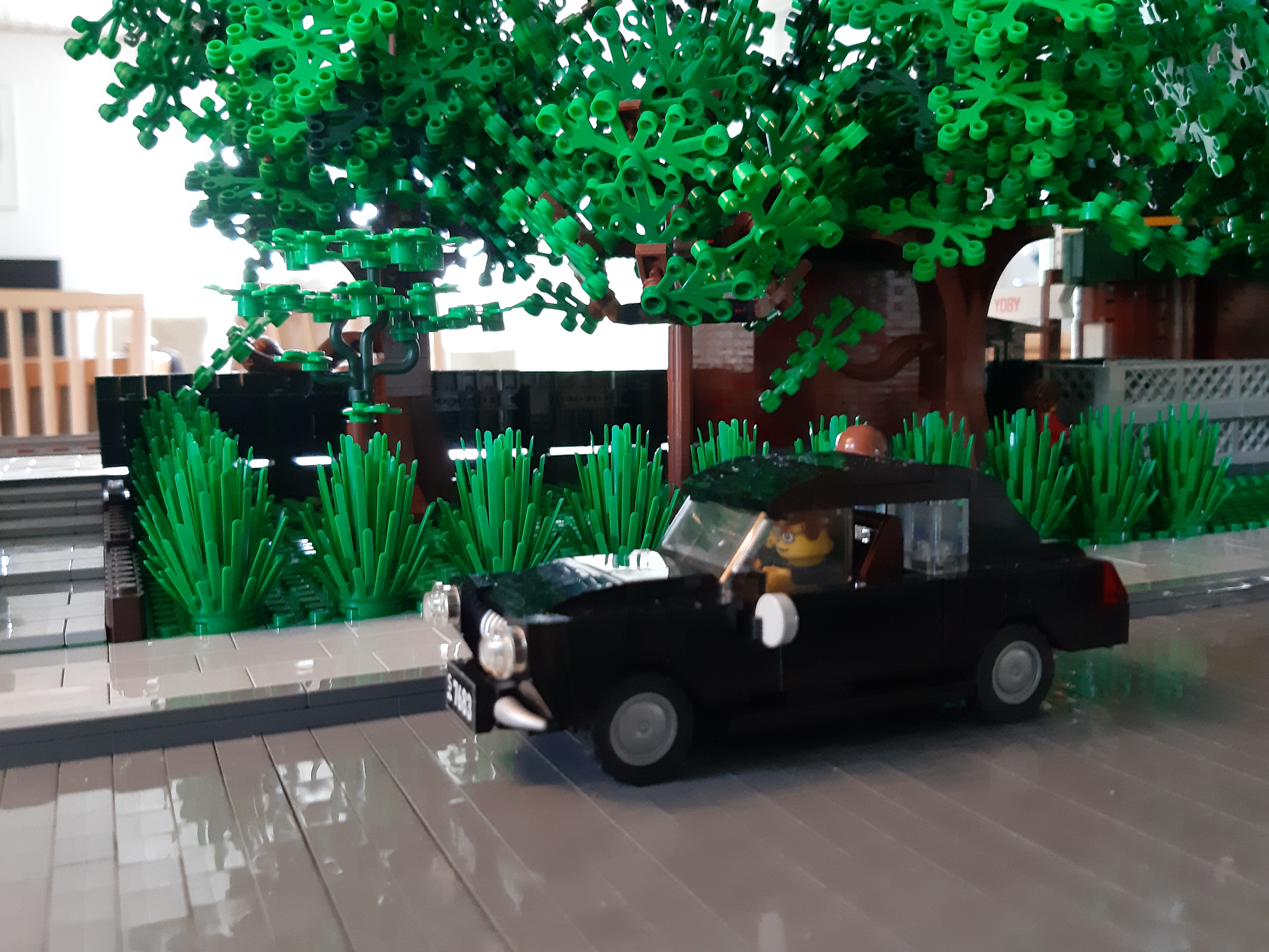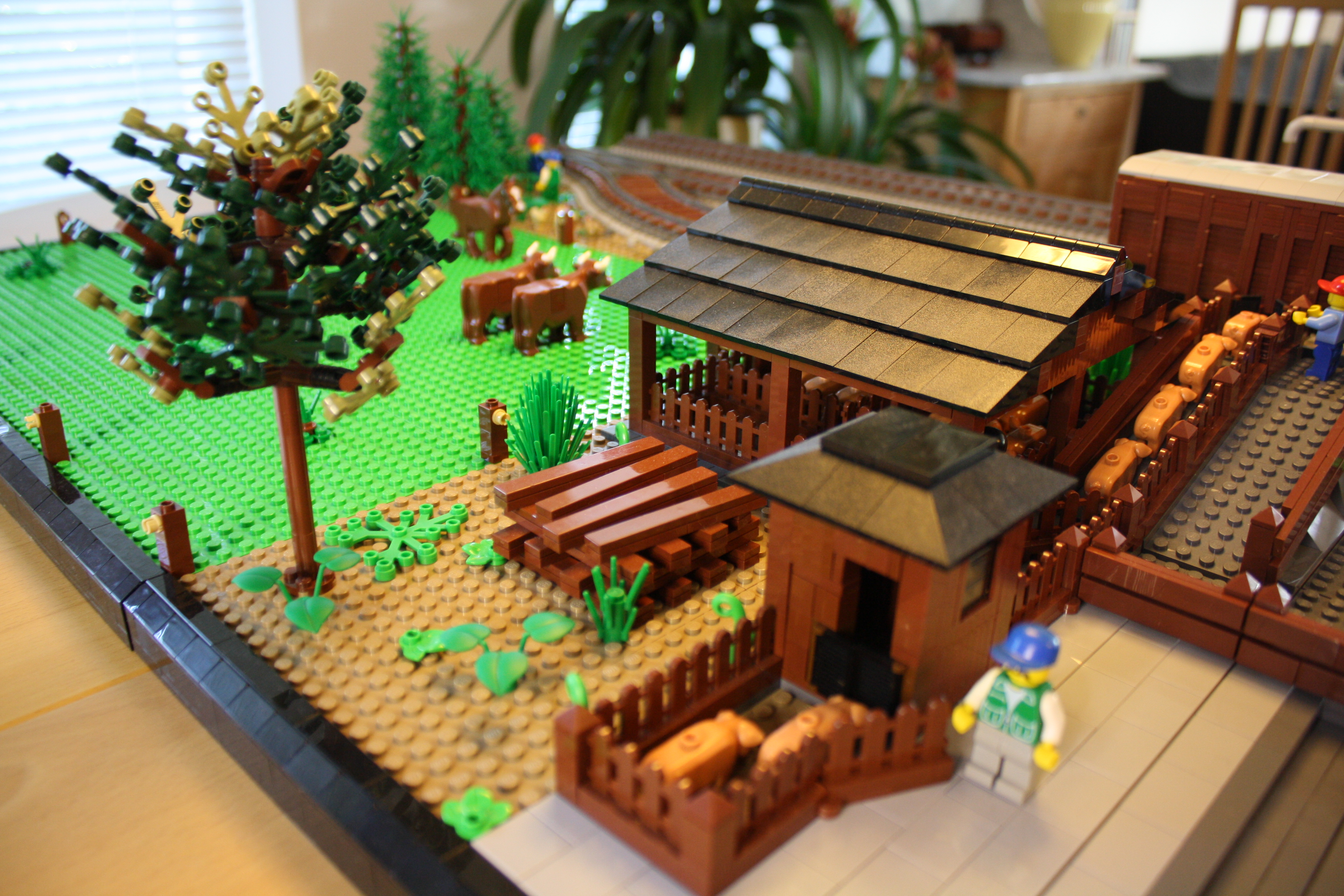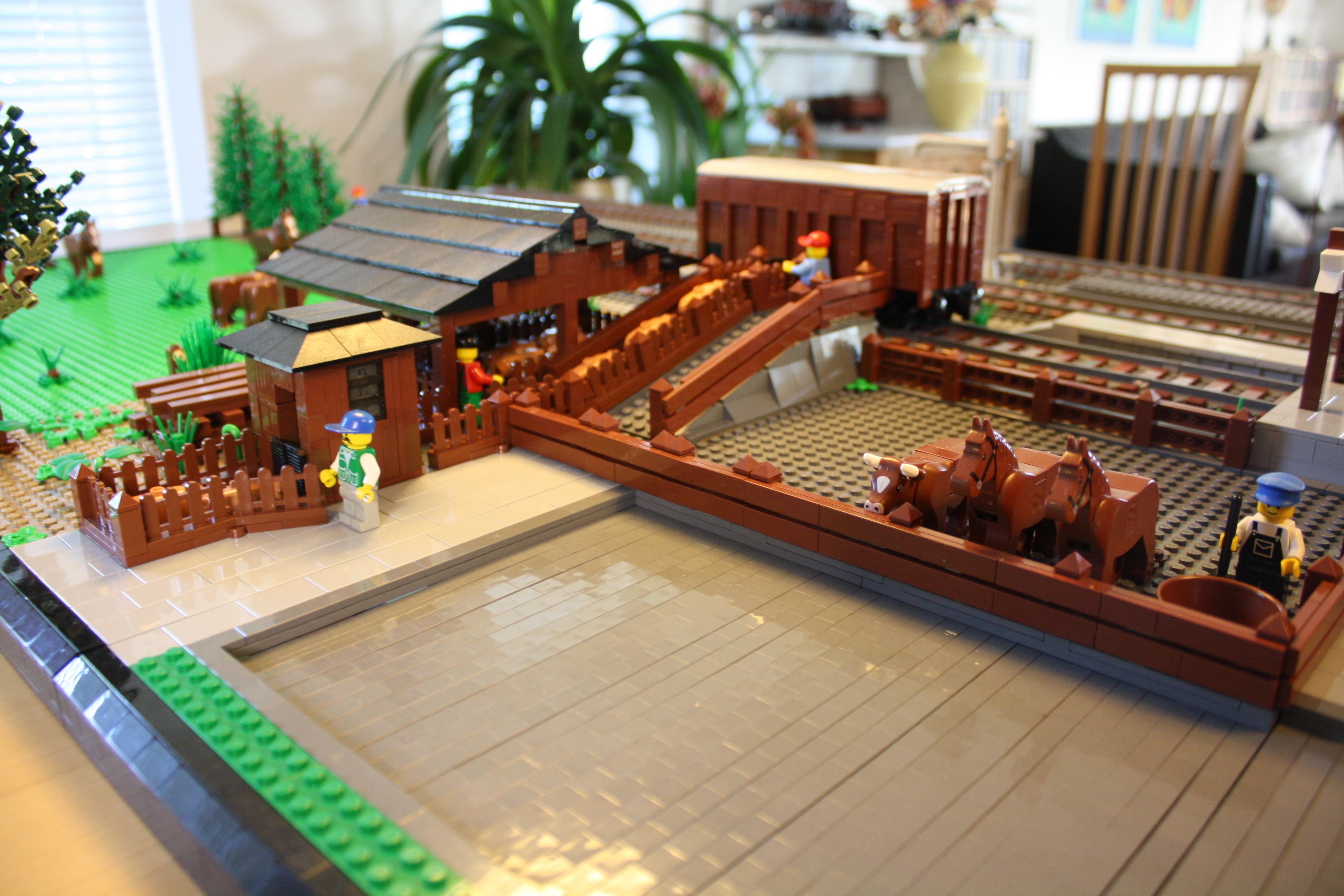 stationsanlægget består af set fra banesiden: ![]() Fra venstre mod højre ses vandtårnet. Dernæst følger toiletbygningen. Begge disse bygninger er på bagsiden omkranset af store træer. I midten af billedet ligger hovedbygningen, og til højre for den ses pakhuset. På læssesporet holder en gammeldags spidsgavlet godsvogn og yderst til højre ses nogle overdækkede svinestier med rampe til toget. Vi skal også lige se det hele fra nogle skrå vinkler. Først kigger vi i retning mod Thisted: ![]() Dernæst i retning mod Struer, hvor man gerne må sammenligne med med dette billede fra Jernbanekilder, der dog er ældre end 1950, som jeg tilstræber at ramme. Derfor slutter perronen lidt før, og vinduerne er stadig mørkegrønne: ![]() De enkele bygninger og anlæg Vandtårnet Ydby ligger præcist midt mellem endestationerne Struer og Thisted. I damptiden var den derfor vandstation, hvilket betyder, at lokomotiverne kunne få påfyldt vand. Af samme grund var der et vandtårn (der i dag er nedrevet) samt to vandkraner (kan ses på det første billede foran hovedbygningen og yderst til højre). På siden af tårnet var der en lille bygning, der rummede et vandrensningsanlæg. Dette kompleks har virkeligt givet udfordringer i LEGO, fordi selve tårnet nederst er rundt. De øverste to-tredjedele består af en 12-kantet trækonstruktion, der ender i et tag formet som en 12-kantet, lav pyramide. Når så også sidebygningens tag skulle indpasses i tårnets trækonstruktion, kom de grå LEGO-hjerneceller på overarbejde. Hertil kommer, at der skulle være en dør i den murede, nederste del af tårnet, og at der i træoverbygningen skulle være to slags vinduer og en udvendig vandmåler. Jeg er dog rimelig tilfreds med resultatet, der ses her: ![]() Som det ses, kunne lokomotiverne også få påfyldt vand direkte fra tårnets tud. Vinduessprosserne er lavet med transparente stickers med hvid tryk (lavet på en Brother Label writer) klæbet på trans-brown tiles. Vandmåleren og de sorte kanter på den nederste gule stribe er lavet med transparente stickers med sort tryk klæbet på henholdsvis hvide og gule tiles. Billedet viser også det klassiske danske stationsskilt med de fligede ender. Det er igen min Brother Label Writer, der er ansvarlig for de røde bogstaver på skiltet. Vi skal også lige se et billede af vandtårnet fra den modsatte side, hvor vi også ser træerne bag ved det: ![]() Toiletbygningen Den lille toiletbygning er der ikke så meget at sige om, men her ses den: ![]() Hovedbygningen Vi er så nået til den vigtigste bygning på anlægget, nemlig selve hovedbygningen, der ses her: ![]() Jeg har valgt at bygge alle røde murstensmure af 1x2 plader med reddish brown som hovedfarve, men ca 20% af pladerne i dark red og nogle få procent i dark brown. Formålet er naturligvis at få et mere levende murværk. Taget er lavet af 1x2 tiles for at få det til at ligne skifertag. Hvad angår selve bygningen, ligger ventesalen i venstre ende (de store vinduer i gavlen). Stationens kontor befinder sig bag de to første vinduer mod perronen, og de to sidste vinduer hører til stationsforstanderens lejlighed (han boede jo på stedet). Det lille vindue (2 fag) er til spisestuen og det store vindue (3 fag) er til soveværelset. Det er en sjov tanke, at når folk færdedes på perronen, har de gået lige uden for vinduerne til forstanderens private bolig. På første sal er der (i modsatte gavl) et pigeværelse. For en ordens skyld skal jeg understrege, at bygningen i min model ikke er indrettet. Der er tomt (et stort rum) bag alle vinduer. Pakhuset For en landstation som Ydby er pakhuset uhyre vigtigt. Thybanen blev straks fra starten en kæmpe succes og banen åbnede sognet op for omverdenen. Stykgods til egnens virksomheder og landmænd fyldte meget, og levende dyr blev sendt med toget. Vi ser pakhuset her: ![]() Som det måske kan fornemmes på billedet, er pakhuset opført i en mere ydmyg stil end hovedbygningen. I den ende, der ligger nærmest hovedbygningen var der dels et vaskerum og dels et rum til brændsel. Begge rum havde indgang fra den lille gård, der findes mellem de to bygninger. I gavlen kan man måske fornemme, at der stikker en bjælke ud (over gavllemmen), der blev brugt til at hejse varer op på loftet. I forgrunden ses det andet stationsskilt. Foldanlægget Levende dyr var en vigtig godstype for enhver landstation i ”gamle dage”. Det var også tilfældet i Ydby, hvor der var en grusbelagt kvægfold og overdækkede svinestier med brolægning. Både stier og fold havde rampe til toget. Her ser vi først svinestierne fra banesiden, hvor en QH vogn (endnu ikke helt færdig) er klar til at blive læsset med levende svin: ![]() Hvis vi i stedet bevæger os om på den anden side, ses hele anlægget: ![]() Til højre ses kvægfolden, hvor en ko og et par heste venter på at blive sendt med toget. Til venstre ses først svineanlæggets modtagefold, dernæst den lille vejerbod efterfulgt af de overdækkede svinestier og ramperne. En flok svin er på vej op ad rampen for at blive læsset på QH vognen. Gadesiden ”Gadesiden” skal tages med forbehold. Ydby er en landstation, og der er ikke nogen "gade" på bagsiden. Det er blot en indkørsel til stationen. Jeg antager, at indkørsel og parkeringsplads har været brolagt, hvilket er søgt efterlignet med liggende (let forskudte) 1x1 klodser i DBG. Min oprindelige plan var at blande med gammel dark gray og sand blue (tror jeg nok, det hedder) for at få mere realistisk spil i brolægningen (hvor der er brugt flere tusinde klodser), men prisniveauet på BrickLink overbeviste mig om, at det var godt nok med DBG. Vi ser bygningerne set fra ”gaden” ![]() Især hovedbygningen, synes jeg, tager sig godt ud. Datidens arkitekter i DSB kunne simpelthen noget. Livet på en landstation Passagerer Ydby er et lille sogn med begrænset indbyggertal. Det har derfor aldrig myldret med mennesker på perronerne, men nogle var der nat